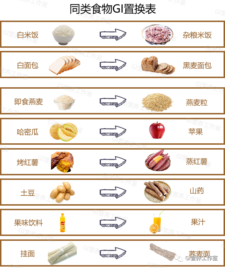 而低GI食物具有低能量、高膳食纖維的特性,可使胃腸道容受性舒張,增加飽腹感,有利于降低總能量攝入,并且低GI飲食可降低餐后血糖峰值,減少血糖波動、胰島素分泌的速度和數量,從而降低餐后血糖和胰島素應答。