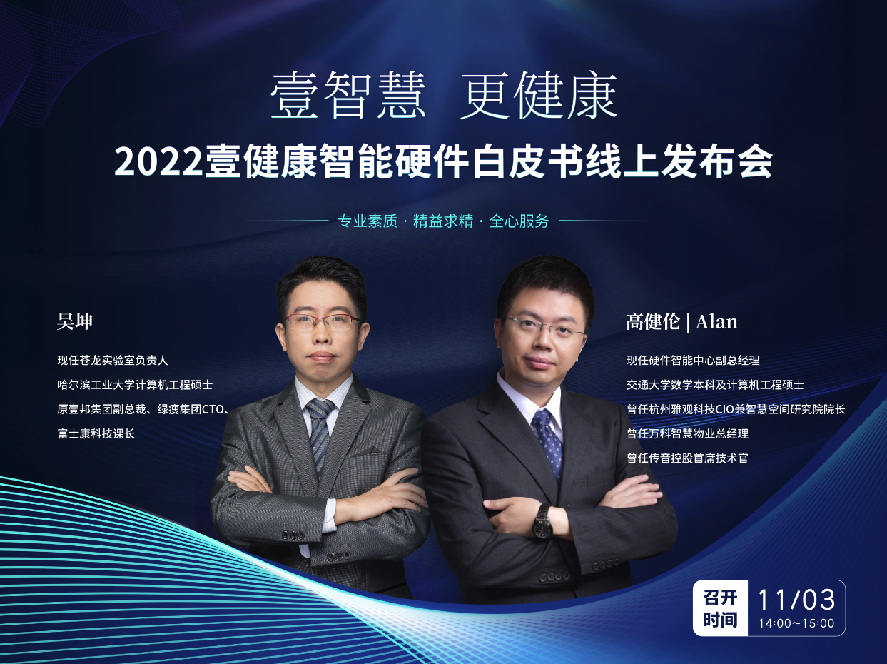 此次發布的《2022壹健康智能硬件白皮書》由壹健康硬件智能中心副總經理高健倫與蒼龍實驗室負責人吳坤聯合主講,主要闡述和解讀三部分內容:第一,健康智能硬件產業分析;第二,產品與智慧大健康云服務方案;第三,市場生態發展趨勢。