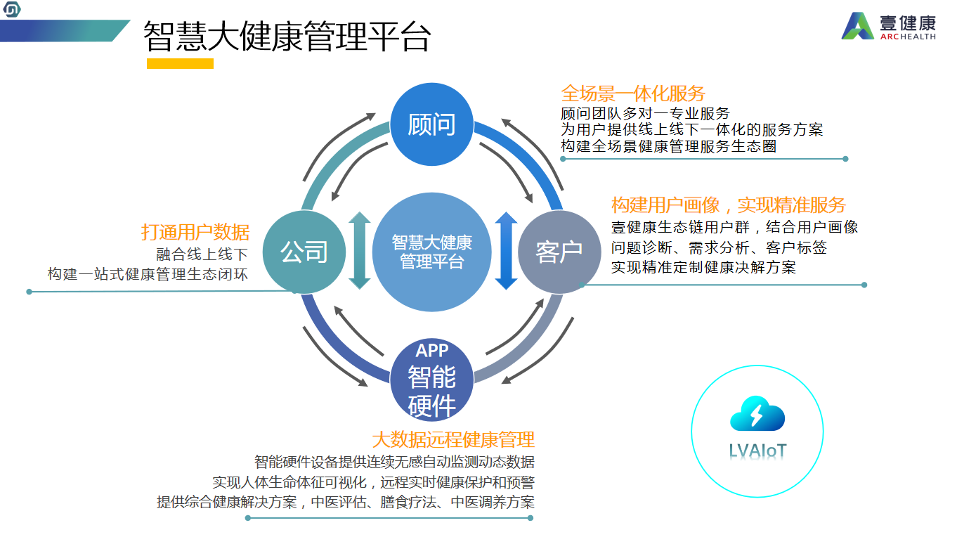 壹健康集團為實現全過程全生命周期的健康管理,并行發展體重管理、慢病管理、心理健康、亞健康監測管理等用戶場景系統,與眾多硬件生態合作伙伴集約匯聚,共同打造大健康人工智能物聯網賦能平臺。依托壹健康生態鏈用戶群,結合用戶畫像、問題診斷、需求分析、客戶標簽,讓用戶通過一對一健康顧問,享受精準定制健康服務。